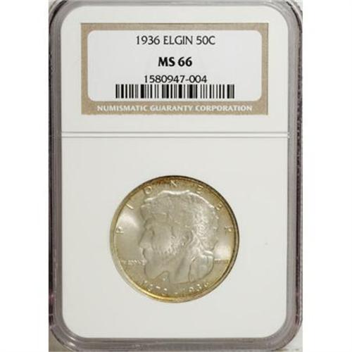<B>1936 50C Elgin MS66 NGC.</B></I> NGC Census: (706/111). PCGS Population (960/112). Mintage: 20,015. Numismedia Wsl. Price for NGC/PCGS coin in MS66: $436. (#9303)<BR><BR><b>Shipping:</b> Coins & Currency (<a target="_blank" href="http://www.heritageauctions.com/common/shipping.php">view shipping information</a>\)