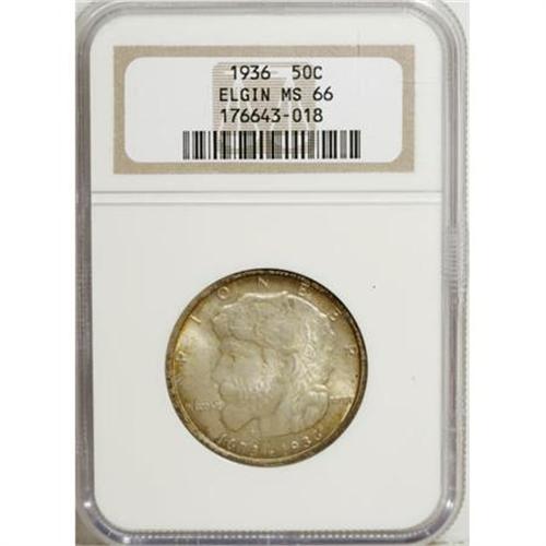 <B>1936 50C Elgin MS66 NGC.</B></I> NGC Census: (706/111). PCGS Population (960/112). Mintage: 20,015. Numismedia Wsl. Price for NGC/PCGS coin in MS66: $436. (#9303)<BR><BR><b>Shipping:</b> Coins & Currency (<a target="_blank" href="http://www.heritageauctions.com/common/shipping.php">view shipping information</a>\)