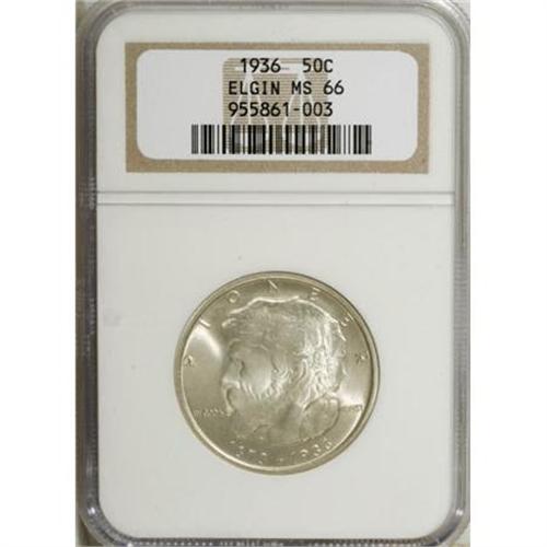 <B>1936 50C Elgin MS66 NGC.</B></I> . NGC Census: (718/114). PCGS Population (978/113). Mintage: 20,015. Numismedia Wsl. Price for NGC/PCGS coin in MS66: $420. (#9303)<BR><BR><b>Shipping:</b> Coins & Currency (<a target="_blank" href="http://www.heritageauctions.com/common/shipping.php">view shipping information</a>)