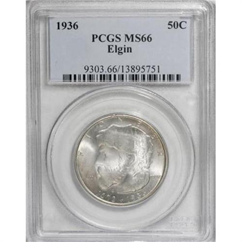 <B>1936 50C Elgin MS66 PCGS.</B></I> PCGS Population (967/113). NGC Census: (699/111). Mintage: 20,015. Numismedia Wsl. Price for NGC/PCGS coin in MS66: $436. (#9303)<BR><I>From The Frank DuVall Collection of U.S. Commemoratives.</B></I><BR><BR><b>Shipping:</b> Coins & Currency (<a target="_blank" href="http://www.heritageauctions.com/common/shipping.php">view shipping information</a>\)