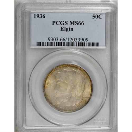<B>1936 50C Elgin MS66 PCGS.</B></I> PCGS Population (968/112). NGC Census: (715/111). Mintage: 20,015. Numismedia Wsl. Price for NGC/PCGS coin in MS66: $436. (#9303)<BR><BR><b>Shipping:</b> Coins & Currency (<a target="_blank" href="http://www.heritageauctions.com/common/shipping.php">view shipping information</a>)