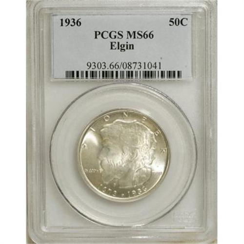 <B>1936 50C Elgin MS66 PCGS.</B></I> PCGS Population (980/113). NGC Census: (717/114). Mintage: 20,015. Numismedia Wsl. Price for NGC/PCGS coin in MS66: $420. (#9303)<BR><BR><b>Shipping:</b> Coins & Currency (<a target="_blank" href="http://www.heritageauctions.com/common/shipping.php">view shipping information</a>)