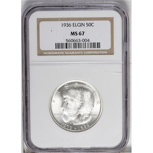 <B>1936<50C> Elgin MS67 NGC.</B></I> Delicate pink, gold, and violet patina graces each side of this frosty and well struck coin. NGC has certified just five finer examples (9/06).