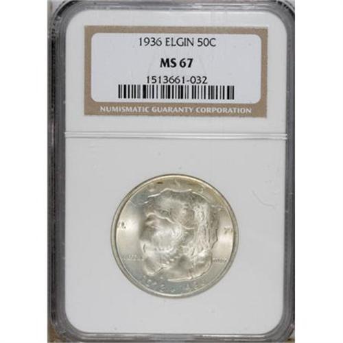 <B>1936 50C Elgin MS67 NGC.</B></I> Olive-gold toning graces the fields of this lustrous and impressively smooth Superb Gem. The strike is crisp, since only the hair above the ear lacks definitive detail.<BR><BR><b>Shipping:</b> Coins & Currency (<a target="_blank" href="http://www.heritageauctions.com/common/shipping.php">view shipping information</a>)