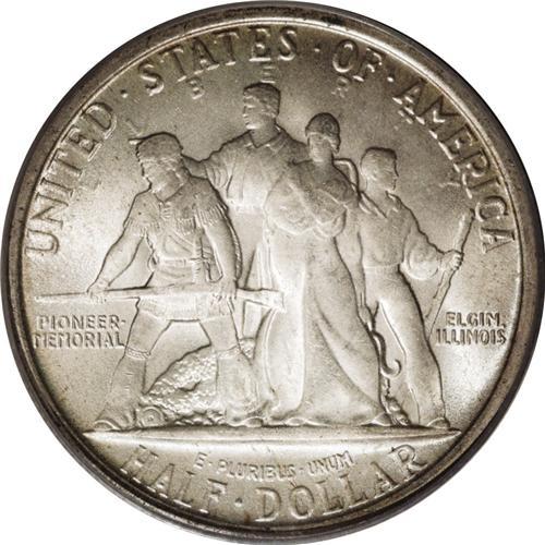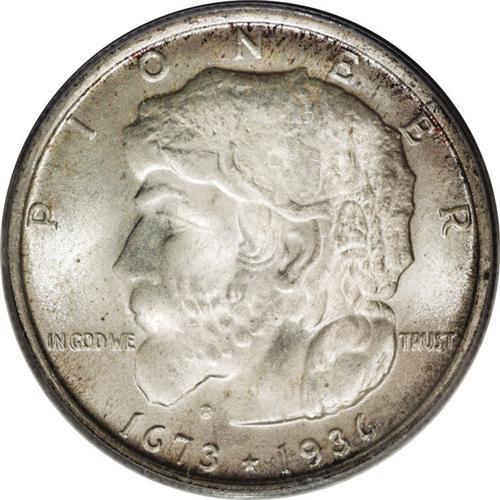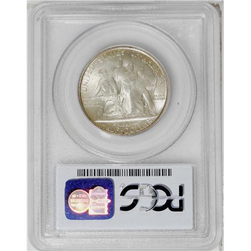 <B>1936<50C> Elgin MS67 PCGS.</B></I> Intermittent golden-tan and charcoal-gray patina appears at the periphery of this frosty Superb Gem. Well struck with two minor marks on the rifle-bearing frontiersman's right (facing) shoulder. PCGS has certified just three finer examples (8/06).<BR><I>From The Hamburg-Sonoma Collection.</B></I>