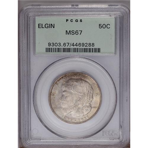 <B>1936<50C> Elgin MS67 PCGS.</B></I> Pastel tan, lilac, and olive colors endow this lustrous and charming Superb Gem. The strike is above average for this sometimes mushy type. Certified in a green label holder. <BR><BR><B>Important notice:</B> Heritage usually auctions material at the rate of 200-250 lots per hour. On some occasions eBay Live bid software or the Internet may not be able to keep up with the pace of the auction. We recommend placing a realistic absentee bid now as insurance to avoid disappointment. Occasionally the auctioneer may eliminate or reject an eBay Live bid, and the auctioneer may also reopen a lot after the close of the eBay live bidding (usually because we missed an audience bid), and may reject your bid even if it shows you as the winning bidder. By bidding via eBay Live, you agree that Heritage may award the lot to another bidder at its sole discretion under the circumstances described above or any other reasonable circumstances. Since eBay bids are not shown to us until we open the lot on the floor, we treat those bids just like floor bids. In most cases the floor responds before the eBay bid is presented to us, due to Internet lag time, so for consistency we have made it a policy that floor bids are always considered first over tie eBay live bids. Also please note that all Heritage lots purchased through eBay Live carry a 20% Buyer's Premium. Please make sure you read the Terms and Conditions before you bid. This lot is being auctioned in conjunction with a live floor auction by Heritage Galleries & Auctioneers. All final auction and invoice information will be supplied by Heritage Galleries & Auctioneers, and all other information should be considered preliminary. Lot:4934 <BR><BR><B>Winning Notification and Billing:</B> After the FINAL session in this auction is complete, Heritage will send e-mail and snail mail invoices. This process normally takes several days. All final auction and invoice information will be supplied by Heritage Galleries & Auctioneers, and all other information should be considered preliminary. <BR><BR>This auction will be conducted on a live auction floor and over the Internet through eBay Live. If you choose to place an absentee bid, please take a moment to <font color='#0000ff'><u><a href='http://pages.ebay.com/liveauctions/help/before/laabsentee.html'>learn how eBay Live absentee bidding works</a></u></font><font color='#000000'>