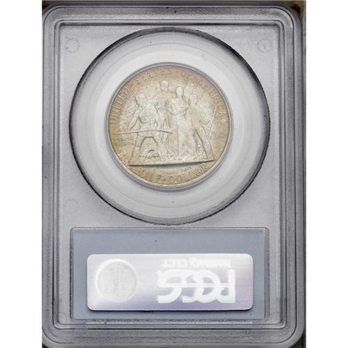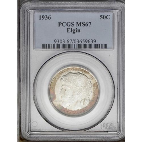 <B>1936<50C> Elgin MS67 PCGS.</B></I> The tab-toned obverse displays sea-green and orange-red patination, which also adorns the reverse periphery. This lustrous and well preserved Superb Gem features a boldly defined baby within the Pioneer Family sculpture.