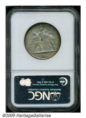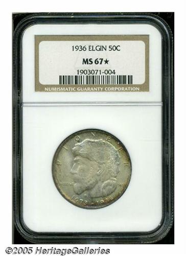 <B>1936<50C> Elgin MS67 <S NGC.</B></I> Like most Elgin Commems, this coin displays richly frosted surfaces. There are crescents of more or less intense antique-gold, crimson, and emerald-green shadings toward the right (facing) borders. The design elements are sharply impressed, and the few miniscule marks on the boy's left leg are not bothersome. Population: 7 in 67 With <S, 3 finer (5/05).