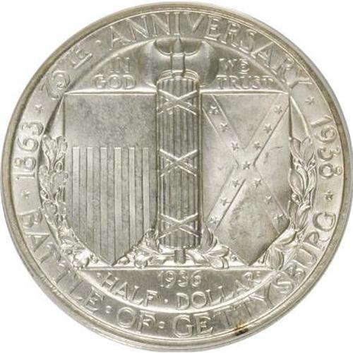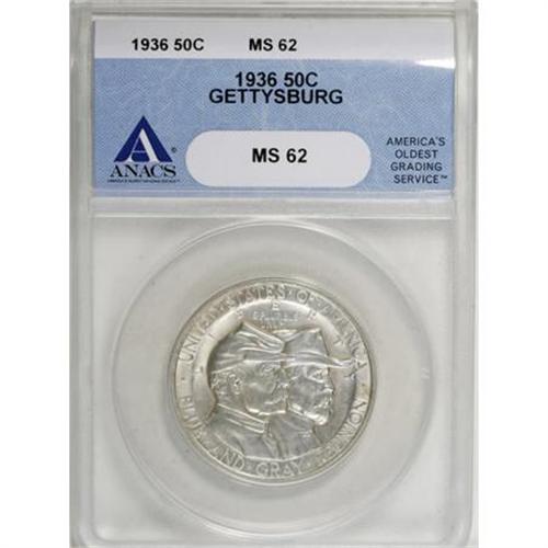 <B>1936 50C Gettysburg MS62 ANACS.</B></I> NGC Census: (55/2559). PCGS Population (116/4467). Mintage: 26,928. Numismedia Wsl. Price for NGC/PCGS coin in MS62: $363. (#9305)<BR><BR><b>Shipping:</b> Coins & Currency (<a target="_blank" href="http://www.heritageauctions.com/common/shipping.php">view shipping information</a>)