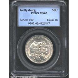 1936 50C Gettysburg MS62 PCGS. The striated tan patina is sufficiently light for the coin to appear fully brilliant at first glance. The strike and luster are very good. A few slide marks on the Union shield preclude a higher grade. Important notice: We expect to be auctioning lots at the rate of 200-250 per hour. Sometimes eBay Premier live bid software cannot keep up with that pace, so we strongly recommend that you place a realistic proxy bid now as insurance to avoid disappointment. Also please note that all Heritage/CAA lots purchased through eBay Premier carry a 20% Buyer's Premium.