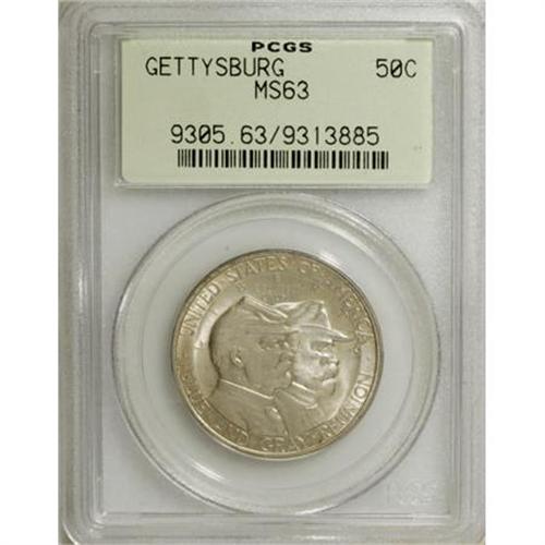 <B>1936 50C Gettysburg MS63 PCGS.</B></I> . PCGS Population (691/3805). NGC Census: (171/2446). Mintage: 26,928. Numismedia Wsl. Price for NGC/PCGS coin in MS63: $388. (#9305)<BR><BR><b>Shipping:</b> Coins & Currency (<a target="_blank" href="http://www.heritageauctions.com/common/shipping.php">view shipping information</a>)
