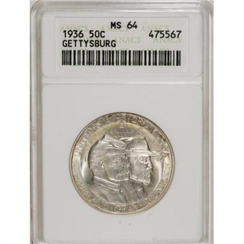 <B>1936 50C Gettysburg MS64 ANACS.</B></I> NGC Census: (1009/1434). PCGS Population (1803/2003). Mintage: 26,928. Numismedia Wsl. Price for NGC/PCGS coin in MS64: $416. (#9305)<BR><BR><b>Shipping:</b> Coins & Currency (<a target="_blank" href="http://www.heritageauctions.com/common/shipping.php">view shipping information</a>)