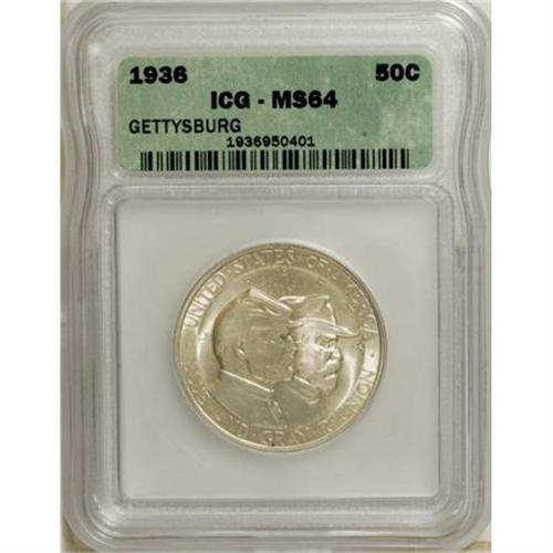 <B>1936 50C Gettysburg MS64 ICG.</B></I> NGC Census: (1009/1434). PCGS Population (1803/2003). Mintage: 26,928. Numismedia Wsl. Price for NGC/PCGS coin in MS64: $416. (#9305)<BR><BR><b>Shipping:</b> Coins & Currency (<a target="_blank" href="http://www.heritageauctions.com/common/shipping.php">view shipping information</a>)