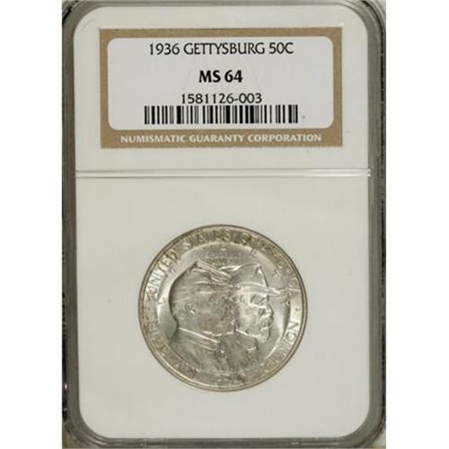 <B>1936 50C Gettysburg MS64 NGC.</B></I> NGC Census: (992/1398). PCGS Population (1793/1977). Mintage: 26,928. Numismedia Wsl. Price for NGC/PCGS coin in MS64: $416. (#9305)<BR><BR><b>Shipping:</b> Coins & Currency (<a target="_blank" href="http://www.heritageauctions.com/common/shipping.php">view shipping information</a>)