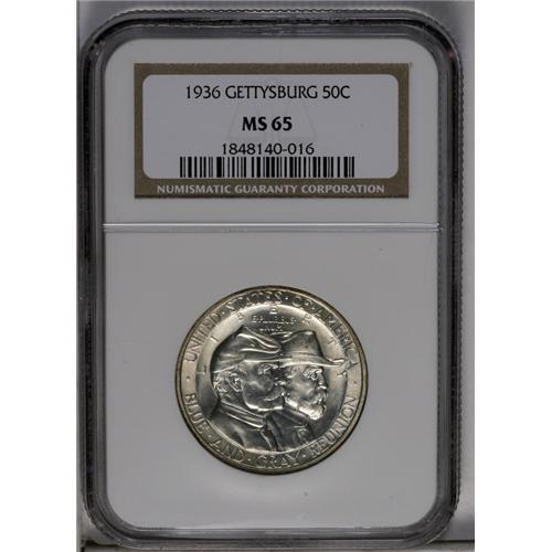 <B>1936<50C> Gettysburg MS65 NGC.</B></I> Near brilliant surfaces display a few wisps of light gold color at the peripheries, and give off sparkling luster. Sharply defined, with just a few minor marks on the reverse shields that limit the grade.