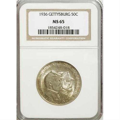 <B>1936 50C Gettysburg MS65 NGC.</B></I> NGC Census: (1097/288). PCGS Population (1325/613). Mintage: 26,928. Numismedia Wsl. Price for NGC/PCGS coin in MS65: $590. (#9305)<BR><I>From The Frank DuVall Collection of U.S. Commemoratives.</B></I><BR><BR><b>Shipping:</b> Coins & Currency (<a target="_blank" href="http://www.heritageauctions.com/common/shipping.php">view shipping information</a>\)