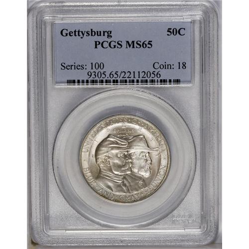 <B>1936<50C> Gettysburg MS65 PCGS.</B></I> A Gem with pink-violet patina on the obverse and russet peripheral toning on the reverse. Nicely struck with clean fields, though a mark is noted beneath the Union soldier's eye.