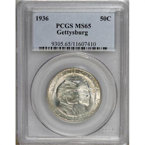 <B>1936 50C Gettysburg MS65 PCGS.</B></I> PCGS Population (1325/613). NGC Census: (1097/288). Mintage: 26,928. Numismedia Wsl. Price for NGC/PCGS coin in MS65: $590. (#9305)<BR><BR><b>Shipping:</b> Coins & Currency (<a target="_blank" href="http://www.heritageauctions.com/common/shipping.php">view shipping information</a>\)