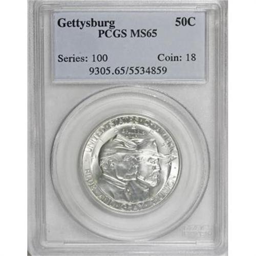 <B>1936 50C Gettysburg MS65 PCGS.</B></I> PCGS Population (1358/637). NGC Census: (1125/304). Mintage: 26,928. Numismedia Wsl. Price for NGC/PCGS coin in MS65: $580. (#9305)<BR><BR><b>Shipping:</b> Coins & Currency (<a target="_blank" href="http://www.heritageauctions.com/common/shipping.php">view shipping information</a>)