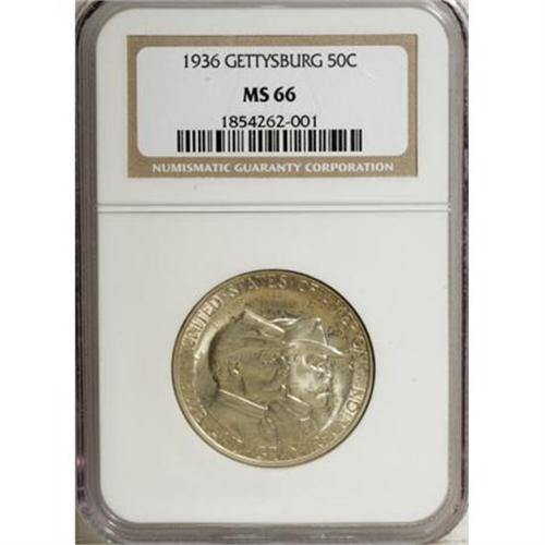 <B>1936 50C Gettysburg MS66 NGC.</B></I> Delicate champagne toning visits the obverse margins and parts of the reverse. A strongly lustrous and pleasingly detailed representative of this Civil War commemorative.<BR><BR><b>Shipping:</b> Coins & Currency (<a target="_blank" href="http://www.heritageauctions.com/common/shipping.php">view shipping information</a>)