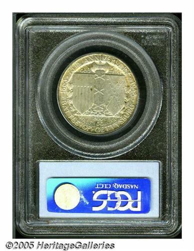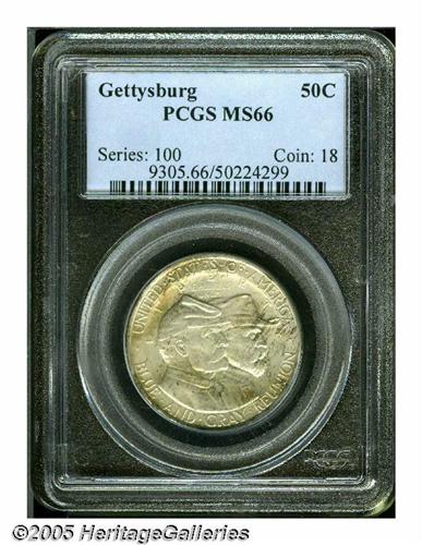 <B>1936<50C> Gettysburg MS66 PCGS.</B></I> Bright mint luster underlies the pale gray-brilliance seen over most of each side. Apparently housed in an original holder of issue for a short time with remainders of tab toning on the obverse.