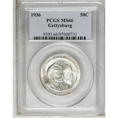 <B>1936<50C> Gettysburg MS66 PCGS.</B></I> Hints of ice-blue appear at the obverse periphery and pale red appears on the left side of the reverse. The devices are well-defined and the surfaces have pleasing luster.