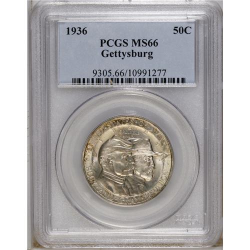<B>1936 50C Gettysburg MS66 PCGS.</B></I> Light russet and gold elements near the rims add variety to the metallic blue-gray patina that covers the remainder of this Premium Gem. Suitably struck and appealing.<BR><BR><b>Shipping:</b> Coins & Currency (<a target="_blank" href="http://www.heritageauctions.com/common/shipping.php">view shipping information</a>)