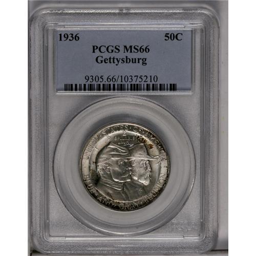 <B>1936<50C> Gettysburg MS66 PCGS.</B></I> Speckles of reddish-gold and apple-green toning visit the peripheries of this sharply struck, lustrous Premium Gem. A few trivial marks on the reverse fasces and the Confederate shield do not distract.