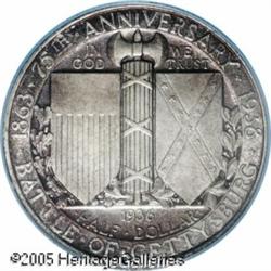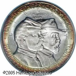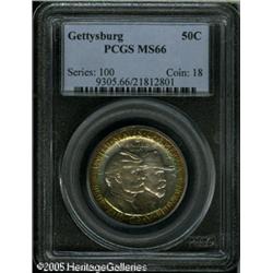 <B>1936 50C Gettysburg MS66 PCGS.</B></I> The obverse is extremely lustrous and encircled in splendid orange and apple-green toning. Speckled gray and violet toning on the reverse create a totally different visual picture. Lot:8494
