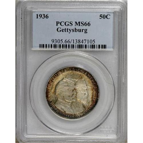 <B>1936 50C Gettysburg MS66 PCGS.</B></I> PCGS Population (538/83). NGC Census: (249/43). Mintage: 26,928. Numismedia Wsl. Price for NGC/PCGS coin in MS66: $790. (#9305)<BR><BR><b>Shipping:</b> Coins & Currency (<a target="_blank" href="http://www.heritageauctions.com/common/shipping.php">view shipping information</a>\)