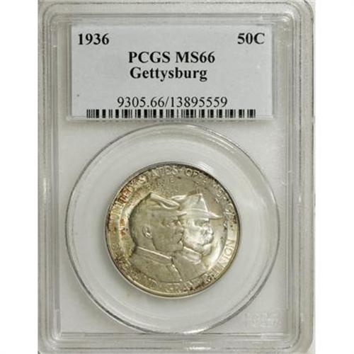 <B>1936 50C Gettysburg MS66 PCGS.</B></I> PCGS Population (530/83). NGC Census: (246/42). Mintage: 26,928. Numismedia Wsl. Price for NGC/PCGS coin in MS66: $790. (#9305)<BR><I>From The Frank DuVall Collection of U.S. Commemoratives.</B></I><BR><BR><b>Shipping:</b> Coins & Currency (<a target="_blank" href="http://www.heritageauctions.com/common/shipping.php">view shipping information</a>\)