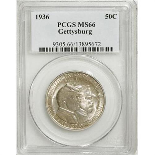 <B>1936 50C Gettysburg MS66 PCGS.</B></I> PCGS Population (530/83). NGC Census: (246/42). Mintage: 26,928. Numismedia Wsl. Price for NGC/PCGS coin in MS66: $790. (#9305)<BR><I>From The Frank DuVall Collection of U.S. Commemoratives.</B></I><BR><BR><b>Shipping:</b> Coins & Currency (<a target="_blank" href="http://www.heritageauctions.com/common/shipping.php">view shipping information</a>\)