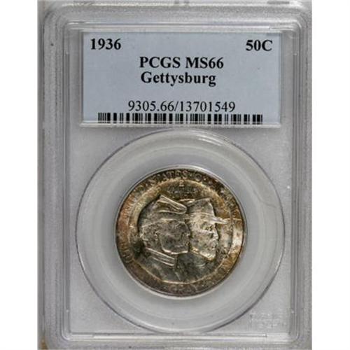 <B>1936 50C Gettysburg MS66 PCGS.</B></I> Blushes of tan-beige toning with faint greenish undertones rest over intensely lustrous surfaces. Sharply struck throughout, with just a few minuscule, grade-consistent marks.<BR><BR><b>Shipping:</b> Coins & Currency (<a target="_blank" href="http://www.heritageauctions.com/common/shipping.php">view shipping information</a>)