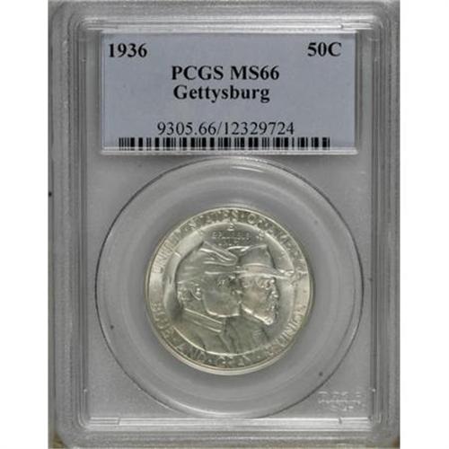 <B>1936 50C Gettysburg MS66 PCGS.</B></I> Both sides of this spectacular commemorative are devoid of color, save for the lightest wash of gold. Brilliant luster is its chief attribute, with thoroughgoing mint frost and premium appeal.<BR><BR><b>Shipping:</b> Coins & Currency (<a target="_blank" href="http://www.heritageauctions.com/common/shipping.php">view shipping information</a>)