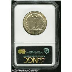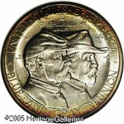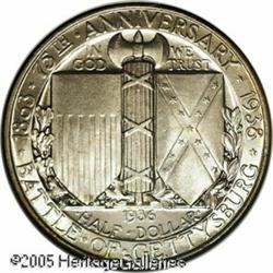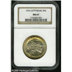 <B>1936 50C Gettysburg MS67 NGC.</B></I> This popular Civil-War battle commemorative is usually found with generously abraded surfaces. This piece is not only exceptionally clean, but the mint luster is thick and very satiny. Mostly brilliant, the obverse displays a relatively narrow band of iridescence around the outer margin. Population: 32 in 67, 1 finer (1/05). Lot:8495