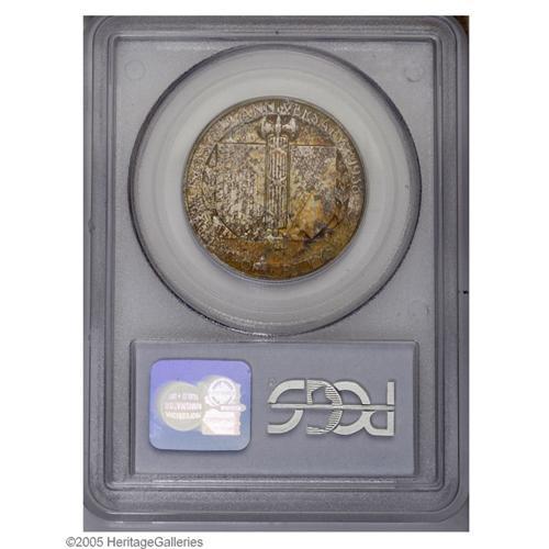<B>1936<50C> Gettysburg MS67 PCGS.</B></I> This is a visually impressive specimen with rich crimson-russet and golden tab toning on the obverse. The balance of that side is silver-gray in sheen, whereas the reverse is coated in the former color with sprays of lavender, blue-gray, and olive-gold iridescence toward the left border. The surfaces are so well preserved that even the reverse shields are silent on the subject of distracting abrasions. A Superb Gem for the toning enthusiast who also appreciates the value of technical quality. Population: 77 in 67, 2 finer (10/05).