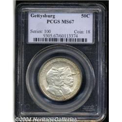 <B>1936<50C> Gettysburg MS67 PCGS.</B></I> Softly frosted with stellar quality surface preservation, this is a mostly silver tinged example whose peripheries reveal delicate golden highlights. <BR><BR><B>Important notice:</B> Heritage usually auctions material at the rate of 200-250 lots per hour. On some occasions eBay Live bid software or the Internet may not be able to keep up with the pace of the auction. We recommend placing a realistic absentee bid now as insurance to avoid disappointment. Occasionally the auctioneer may eliminate or reject an eBay Live bid, and the auctioneer may also reopen a lot after the close of the eBay live bidding (usually because we missed an audience bid), and may reject your bid even if it shows you as the winning bidder. By bidding via eBay Live, you agree that Heritage may award the lot to another bidder at its sole discretion under the circumstances described above or any other reasonable circumstances. Since eBay bids are not shown to us until we open the lot on the floor, we treat those bids just like floor bids. In most cases the floor responds before the eBay bid is presented to us, due to Internet lag time, so for consistency we have made it a policy that floor bids are always considered first over tie eBay live bids. Also please note that all Heritage lots purchased through eBay Live carry a 20% Buyer's Premium. Please make sure you read the Terms and Conditions before you bid.