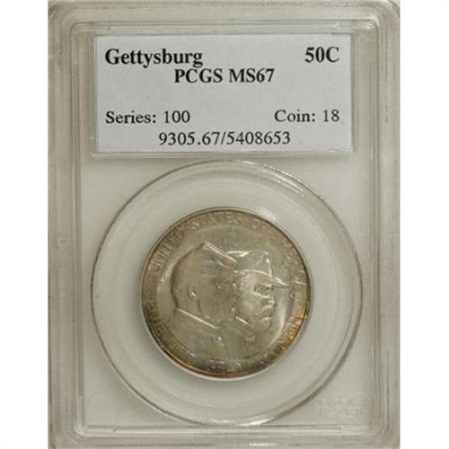<B>1936 50C Gettysburg MS67 PCGS.</B></I> Nearly immaculate surfaces display a soft, frosted sheen and are layered in silver-gray patina, with flashes of colorful reddish-orange iridescence at the borders. <BR><BR><b>Shipping:</b> Coins & Currency (<a target="_blank" href="http://www.heritageauctions.com/common/shipping.php">view shipping information</a>\)