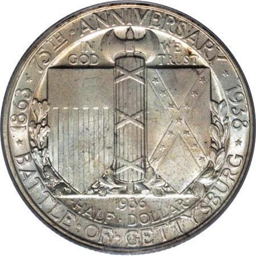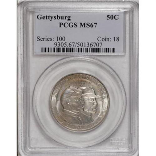 <B>1936 50C Gettysburg MS67 PCGS.</B></I> Pastel mauve and golden-tan patina runs over the lustrous surfaces of this fabulous Gettysburg commemorative half. A well executed strike brings out sharpness on the design features, and both sides are impeccably preserved, including the reverse shields that often reveal noticeable contacts. Population: 81 in 67, 2 finer (12/07).<BR><BR><b>Shipping:</b> Coins & Currency (<a target="_blank" href="http://www.heritageauctions.com/common/shipping.php">view shipping information</a>)