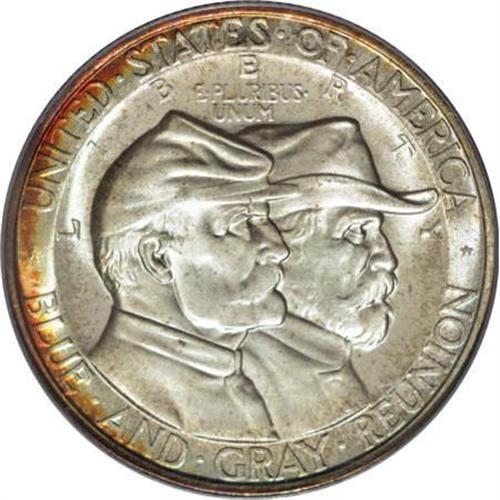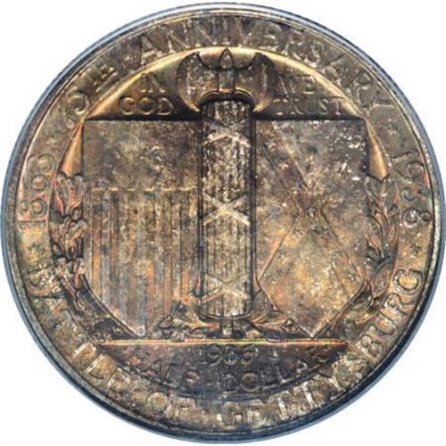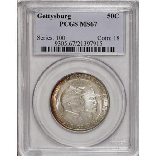 <B>1936 50C Gettysburg MS67 PCGS.</B></I> Lustrous surfaces display a sliver of red-gold and light green patination along the left obverse border, while deep red-gold dominates the reverse, accented with sea-green at the margins. An attentive strike brings out excellent definition on the design elements. Well preserved on both sides. Population: 81 in 67, 2 finer (12/07).<BR><BR><b>Shipping:</b> Coins & Currency (<a target="_blank" href="http://www.heritageauctions.com/common/shipping.php">view shipping information</a>)