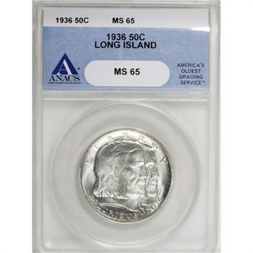 <B>1936 50C Long Island MS65 ANACS.</B></I> NGC Census: (1017/313). PCGS Population (1015/348). Mintage: 81,826. Numismedia Wsl. Price for NGC/PCGS coin in MS65: $348. (#9322)<BR><BR><b>Shipping:</b> Coins & Currency (<a target="_blank" href="http://www.heritageauctions.com/common/shipping.php">view shipping information</a>)