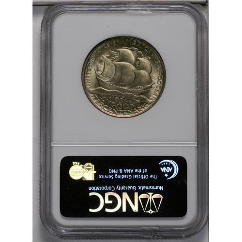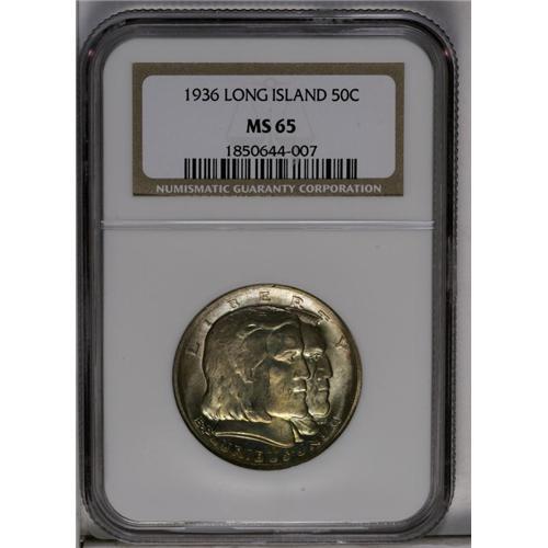 <B>1936<50C> Long Island MS65 NGC.</B></I> A delightful Gem with satiny luster beneath splendid olive, gold, and iridescent toning. This issue was part of a series of commemorative half dollars celebrating local events of little national significance. Designs were by Howard Kenneth Weinman, whose father, Adolph, designed the popular Walking Liberty half dollar issue.