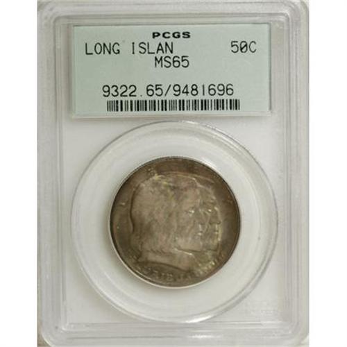 <B>1936 50C Long Island MS65 PCGS.</B></I> Dramatically patinated in ocean-blue, apple-green, and plum-red. Well preserved save for a thin mark on the lower central sail. In an old green label holder.<BR><BR><b>Shipping:</b> Coins & Currency (<a target="_blank" href="http://www.heritageauctions.com/common/shipping.php">view shipping information</a>)