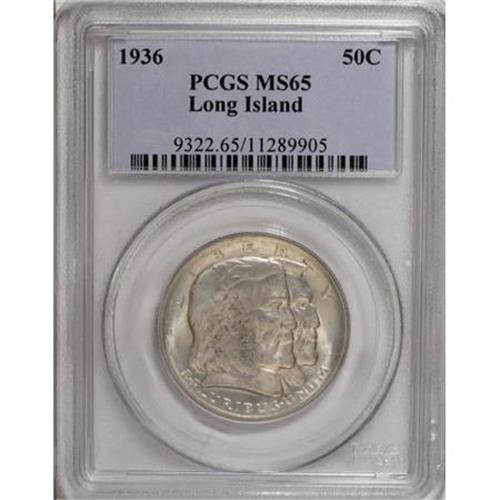 <B>1936 50C Long Island MS65 PCGS.</B></I> . PCGS Population (1026/349). NGC Census: (1032/317). Mintage: 81,826. Numismedia Wsl. Price for NGC/PCGS coin in MS65: $280. (#9322)<BR><BR><b>Shipping:</b> Coins & Currency (<a target="_blank" href="http://www.heritageauctions.com/common/shipping.php">view shipping information</a>)
