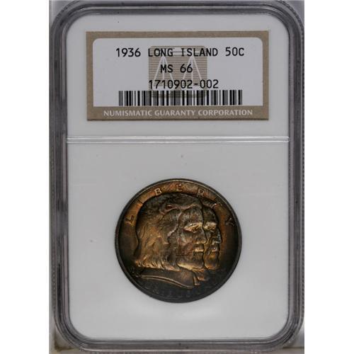 <B>1936<50C> Long Island MS66 NGC.</B></I> This well struck Premium Gem has bronze surfaces with accents of magenta. Lustrous with only a few minuscule abrasions.