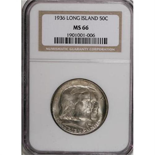 <B>1936 50C Long Island MS66 NGC.</B></I> Well struck with swirling luster and subtle tan-pewter accents at the margins. A handful of minor depressions appear on the sails, though these are largely legacy planchet abrasions from before the piece was struck. NGC has certified 50 finer examples (1/08).<BR><BR><b>Shipping:</b> Coins & Currency (<a target="_blank" href="http://www.heritageauctions.com/common/shipping.php">view shipping information</a>)