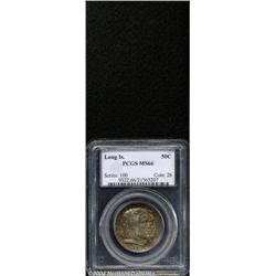 <B>1936<50C> Long Island MS66 PCGS.</B></I> Both sides are deeply toned in multicolored shades of green, orange, purple, and crimson. The design elements are sharply struck, and no major abrasions appear to interrupt the well preserved surfaces. A small, unobtrusive tick at the edge of the settler's hair near the cheekbone is noted for accuracy. Population: 218 in 66, 18 finer (3/04). <BR><BR><B>Important notice:</B> Heritage usually auctions material at the rate of 200-250 lots per hour. On some occasions eBay Live bid software or the Internet may not be able to keep up with the pace of the auction. We recommend placing a realistic absentee bid now as insurance to avoid disappointment. Occasionally the auctioneer may eliminate or reject an eBay Live bid, and the auctioneer may also reopen a lot after the close of the eBay live bidding (usually because we missed an audience bid), and may reject your bid even if it shows you as the winning bidder. By bidding via eBay Live, you agree that Heritage may award the lot to another bidder at its sole discretion under the circumstances described above or any other reasonable circumstances. Since eBay bids are not shown to us until we open the lot on the floor, we treat those bids just like floor bids. In most cases the floor responds before the eBay bid is presented to us, due to Internet lag time, so for consistency we have made it a policy that floor bids are always considered first over tie eBay live bids. Also please note that all Heritage lots purchased through eBay Live carry a 20% Buyer's Premium. Please make sure you read the Terms and Conditions before you bid. </span></font></tr></table></td></tr></table>