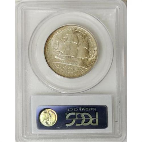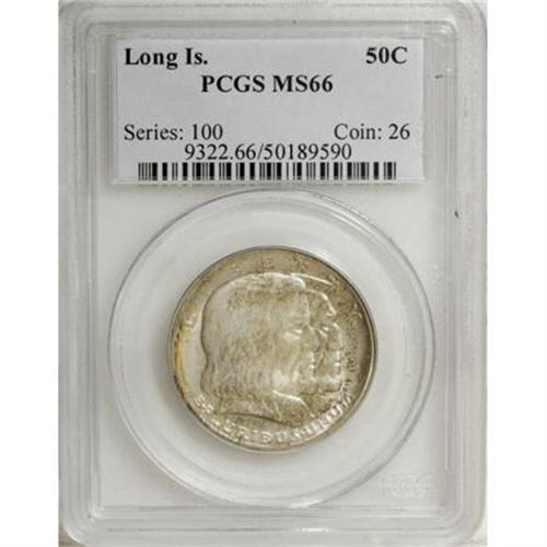 <B>1936 50C Long Island MS66 PCGS.</B></I> The satiny surfaces display cream-gray color that is supplemented by mottled olive, russet, and orange-gold patina, mostly near the borders. Boldly struck and impressively preserved, with just one or two trivial marks on the obverse and the reverse. <BR><BR><b>Shipping:</b> Coins & Currency (<a target="_blank" href="http://www.heritageauctions.com/common/shipping.php">view shipping information</a>)