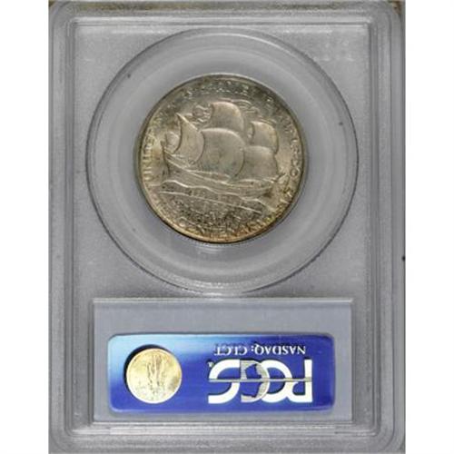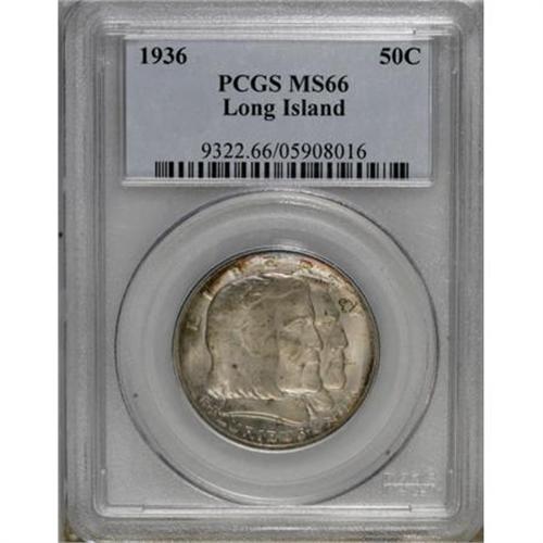 <B>1936 50C Long Island MS66 PCGS.</B></I> Splashes of reddish-orange and gold visit the margins of this luminous Long Island half. The centers are primarily silver-gray and pleasingly preserved. PCGS has graded only 24 finer pieces (2/08).<BR><BR><b>Shipping:</b> Coins & Currency (<a target="_blank" href="http://www.heritageauctions.com/common/shipping.php">view shipping information</a>)