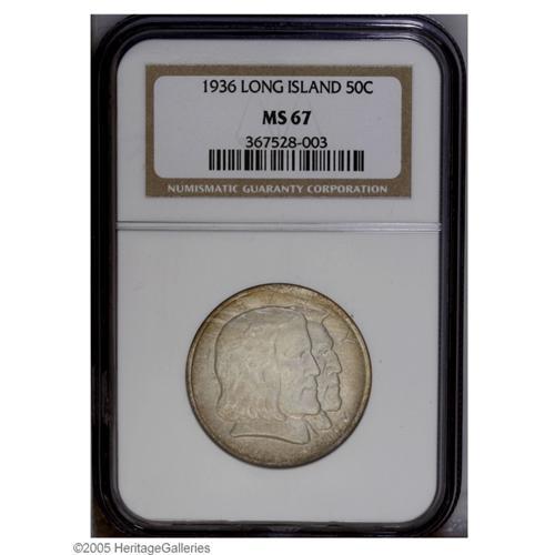 <B>1936<50C> Long Island MS67 NGC.</B></I> An impeccable example with soft frosty surfaces and light ivory color. Both sides are accented by peripheral gold toning. Population: 34 in 67, 2 finer (10/05).